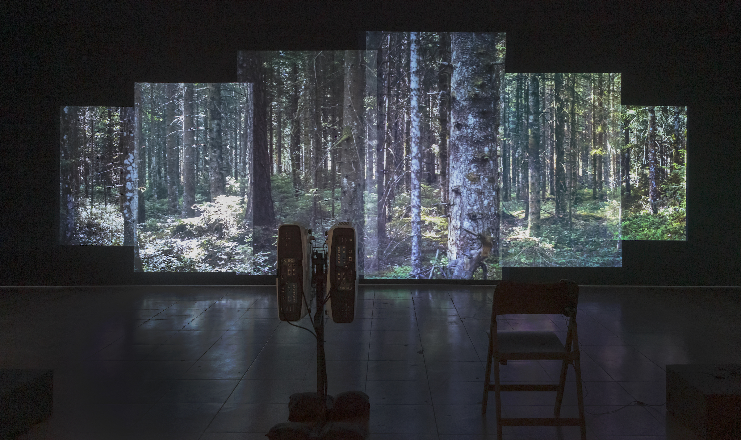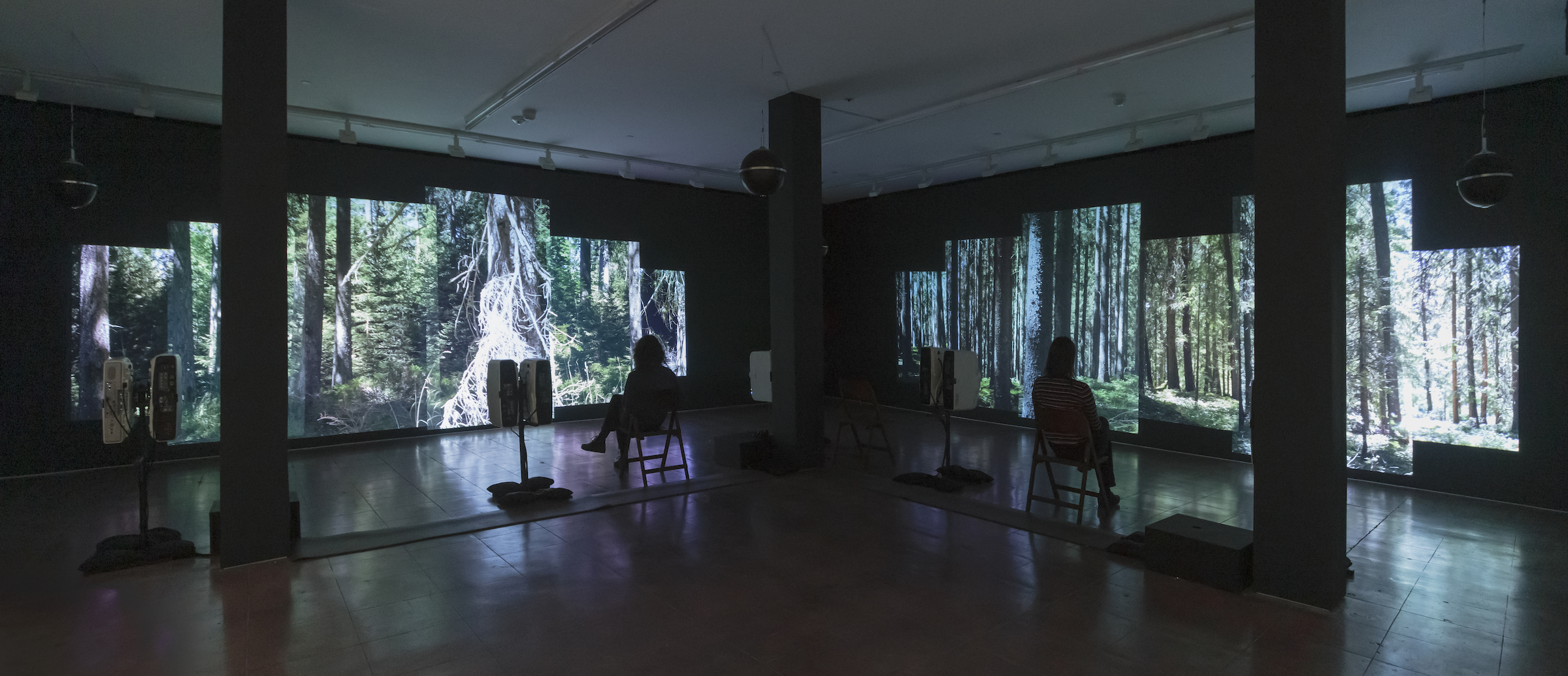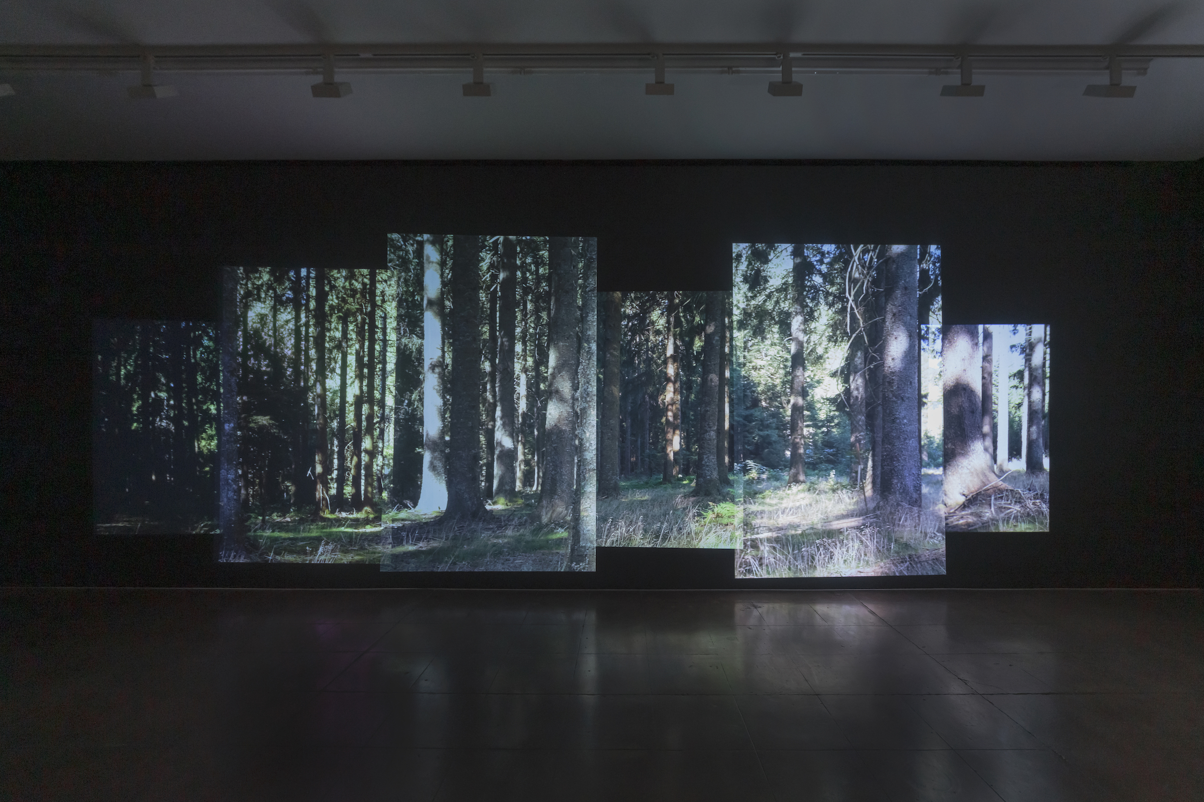 never yet is a video installation comprised of six vertical, overlapping projections on a continuous loop. Destabilizing the image of the landscape, Geyer allows the forest to reorganize itself through visual fragmentation towards a viewer. The accompanying voiceover considers the forest from historical, ideological, and somatic vantage points. Its rich layers weave the artist’s personal experiences as a queer teenager foraging in the woods together with her mother’s wartime stories of being a child in hiding. Also drawing on Geyer’s expansive research into white nationalism’s investment in nature both throughout history and in the present moment of the United States, the installation urges viewers to contemplate how right-wing ideology seeps into their everyday life.