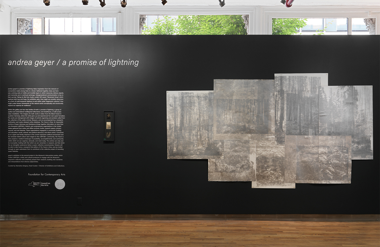 andrea geyer’s a promise of lightning takes inspiration from the network of connections made among trees in a forest. Gathered together, trees can form vast, evolving webs of visible and invisible layers in which resources, distress signals, and memories are in continual exchange. Intergenerational communication is key to their survival. Taking its title from Audre Lorde’s 1973 poem “Movement Song,” which explores both loss and hope, the exhibition asks: How might we consider queerness as a form of multi-temporal relations to and within wider hegemonic cultures? How might under-known frameworks of the natural world conceptually and emotionally expand our capacity for resilience?