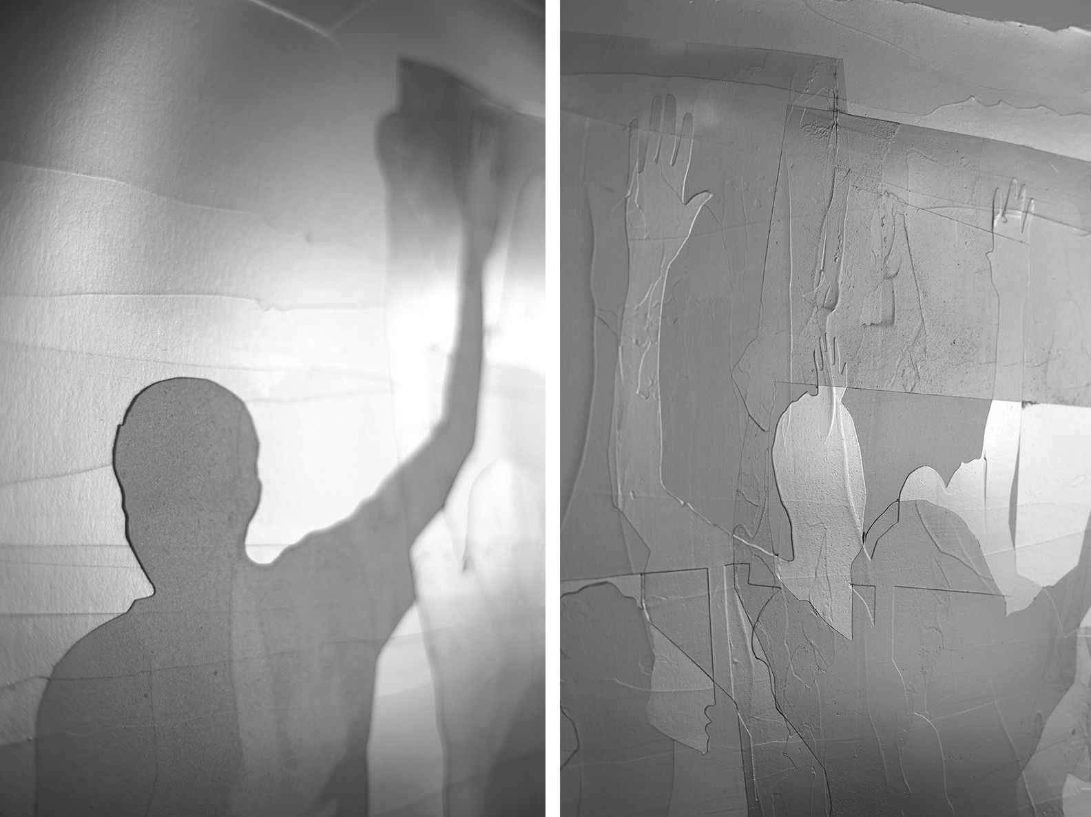 Resonant accumulates materials photographed in protests Geyer participated in since 1996. Layering the outlines of protesters in different shades of silver, quoting black and white photography’s essential materials as well as the vibrancy of bodies in public spaces Resonant engages questions of power and vulnerability, of the individual and the collective, of visibility and protection in public protest. The work layers present protests with past ones, mirroring the layers of events in space over time. It hones in on and isolates shared gestural and bodily genealogies across the moments photographed, materializing them as tools and languages, materially thick, tangible, reflective and fleeting. The resulting layers of thick paint on paper demarcate the margins and dissolve them into each other at the same time. Geyer is interested in the groups that form, that simultaneously amplify and protect those part of it. Resonant is an attempt to capture both the outward facing shifting image and the experience from within, using portraiture both as camouflage and as a form of reveal.